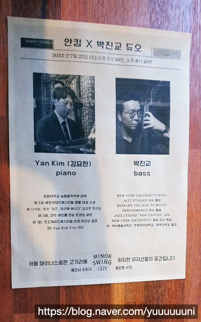 두 분은 평소에도 알고 지내는 사이시라고 해요. 보니까 얀킴 트리오라고 해서 원래 드러머까지 세 분이서 함께 다니시는 것 같아요. 제가 방문한 날에는 드러머가 안 계셨지만 8월 초에는 세 분이서 연주해 주신다고 하네요!