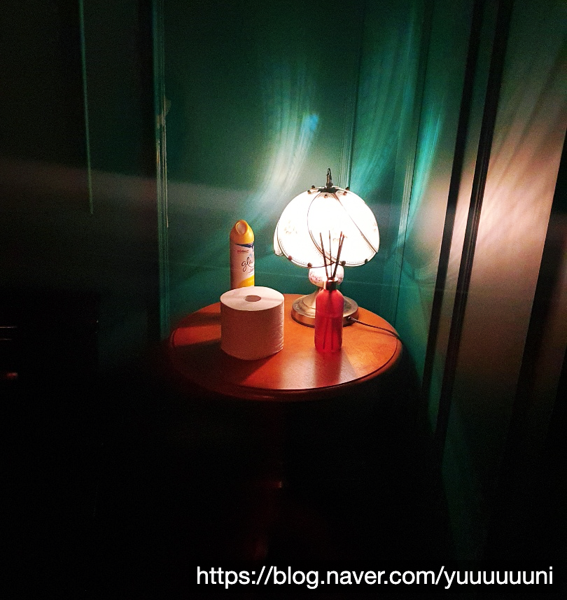 특히나 이 인테리어를 주목해 주세요. 제가 일부러 조금 어둡게 찍긴 했지만 무드 있는 이곳은 바로 화장실이랍니다.