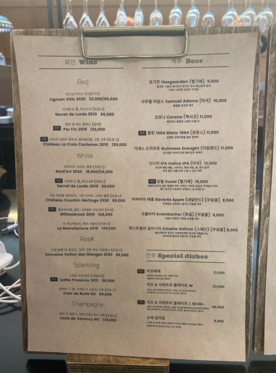마이너 스윙 가격이 적혀있는 메뉴표인데요. 맥주 자체는 엄청 저렴한 편은 아닌 것 같아요. (테이블 가격 별도-!)